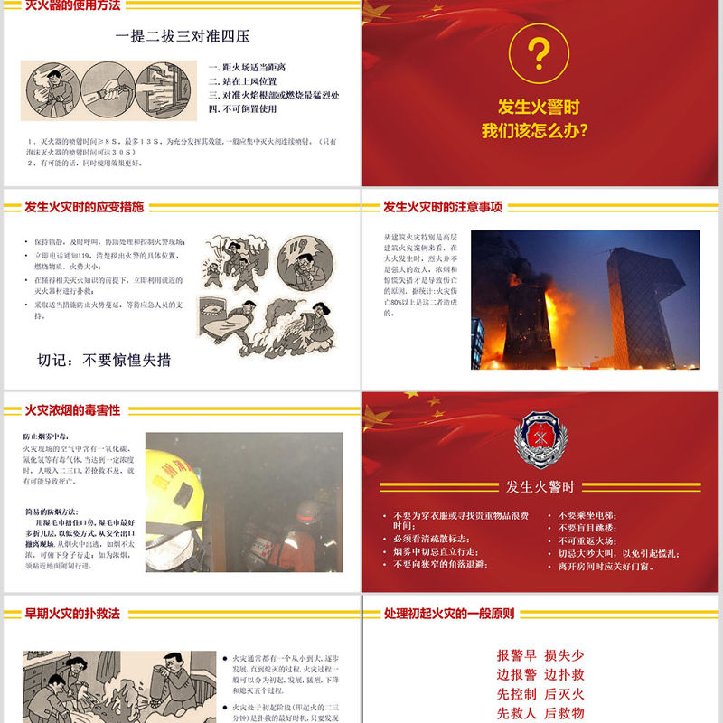 報警早 損失少邊報警 邊撲救先控制 后滅火先救人 后救物防中毒 防窒息聽指揮 莫驚慌處理初起火災的一般原則