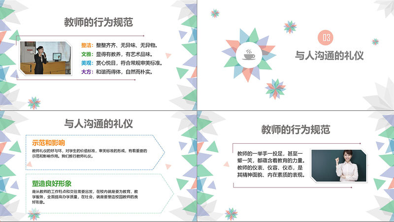 教師的行為規(guī)范整潔:整整齊齊、無異味、無異物。文雅:顯得有教養(yǎng),有藝術品味。美觀:賞心悅目,符合常規(guī)審美標準。大方:和諧而得體,自然而樸實。