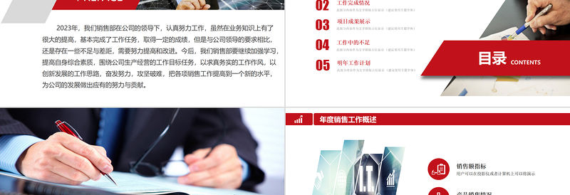 前 言PREFACE 2020年,我們銷售部在公司的領導下,認真努力工作,雖然在業(yè)務知識上有了很大的提高,基本完成了工作任務,取得一定的成績,但是與公司領導的要求相比,還是存在一些不足與差距,需要努力提高和改進。今后,我們銷售部要繼續(xù)加強學習,提高自身綜合素質(zhì),圍繞公司生產(chǎn)經(jīng)營的工作目標任務,以求真務實的工作作風,以創(chuàng)新發(fā)展的工作思路,奮發(fā)努力,攻堅破難,把各項銷售工作提高到一個新的水平,為公司的發(fā)展做出應有的努力與貢獻。