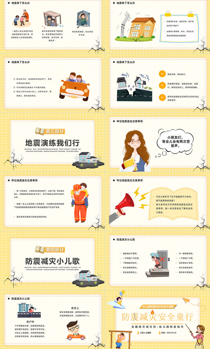 2023防震減災安全童行PPT卡通風幼兒園防震知識科普與演練主題班會課件模板下載