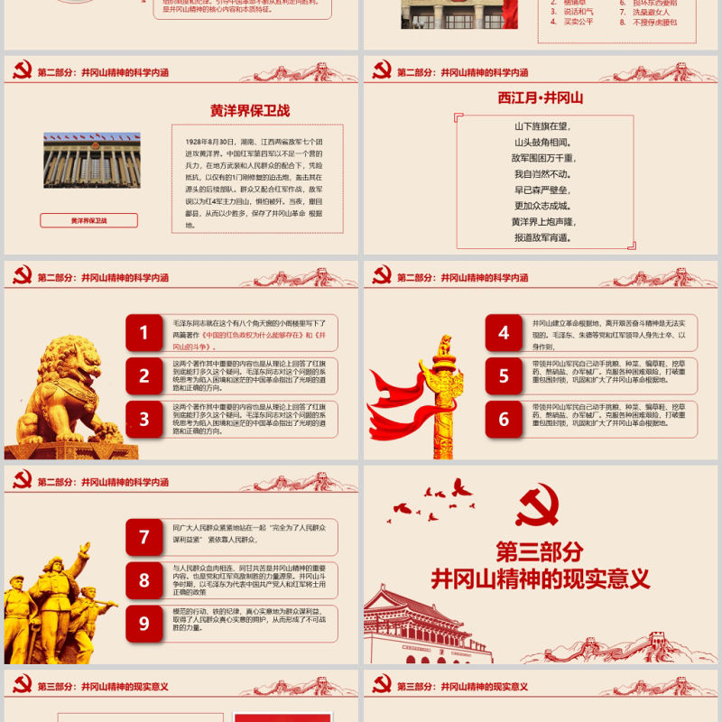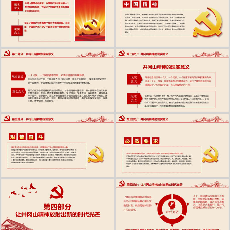 第三部分:井岡山精神的現實意義井岡山是革命勝利的起點。正是從井岡山開始,中國革命才找明了前進的方向。正是由于貫徹了井岡山精神的革命先烈的付出,才有了新中國的誕生,才有了如今蓬勃發展的中國。建設中國特色社會主義,實現中華民族偉大復興的中國夢,就必須依靠全體人民,凝聚全國人民的力量,發揚偉大的中國精神。要求我們學習革命先烈,發揚井岡山精神的堅定信念、實事求是、敢闖新路、艱苦奮斗等精神,為社會主義的建設添磚加瓦。這意味著井岡山精神是實現中國夢、建設中國特色社會主義的必然要求。