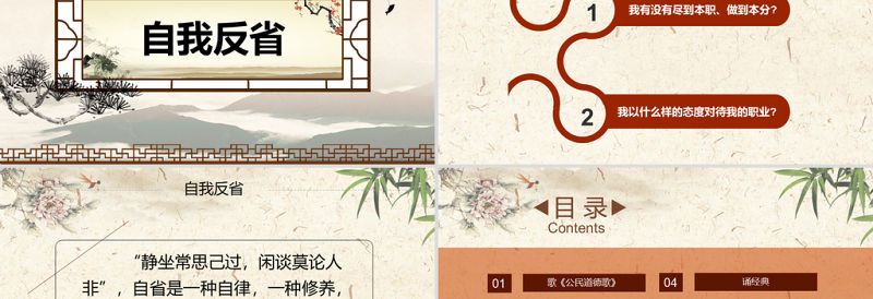 <p>匯報人:通用名</p><br><p>自我反省</p><br><p>自我反省我以什么樣的態度對待我的職業?我有沒有盡到本職、做到本分?12</p><br><p>自我反省 “靜坐常思己過,閑談莫論人非”,自省是一種自律,一種修養,更是一種節操,一種追求。希望自省成為我們終身受益的習慣。</p><br><p>目 錄Contents</p><br><p>歌《公民道德歌》</p><br><p>唱一首歌曲</p><br><p>道德故事</p><br><p>道德故事—最美路姐2009年,上官一木考入省交通運輸廳鄂西高速公路管理處,成為一名普通高路收費員。她的第一個崗位在全省海拔最高、環境最惡劣的利川白羊塘收費站。“去上班時正是冬天,沒幾天手上便生了凍瘡。每天在崗亭工作8小時回到寢室,室內冷如冰窟,窗外寒風呼嘯,半夜一覺醒來,身上還是冷的,只想哭。”她甚至有過辭職的想法,但最終還是堅持下來,并慢慢喜歡上了這份工作。“雖然自己和同事們辛苦,但和那些頂風冒雪奔波在路上的司機比起來卻要幸福得多。”上官一木給自己立下規矩,不論心情怎樣,只要車輛進站,必須給司機一個真誠的微笑,一句溫暖的問候。因為真誠,慢慢地,經常從這里過站的司機記住了她,叫不出名字,就以“笑得特別好看的那個姑娘”相稱。</p><br><p>學模范</p><br><p>學模范深井收費站收費班長袁建凱七年的時光如水而逝,可其中的點點滴滴,酸甜苦辣只有他自己才能真正體會,無論是當收費員還是收費班長,他總是懷著一種神圣的責任感和使命感,始終保持昂揚向上的精神狀態,全身心的投入到收費工作中。宣大給了他太多的感動,這些感動使他把青春無愿無悔地奉獻給了他所鐘愛的高速公路事業。 ——他就是深井收費站收費班長袁建凱</p><br><p>學模范深井收費站收費班長袁建凱收費工作看似簡單,收費、放行好似重復的機械化作業,其實不然,在收費過程中經常會有很多料想不到的事件發生,由于深井收費站人員較少,地理位置又很特殊,總有一些不法司機圖謀不軌,妄想貪占國家便宜,身為收費班長要隨時注意觀察,發現不良苗頭,及時采取應急措施。記得去年秋天的一個午后,袁建凱正在執行疏導任務,只見下道方向一輛斯太爾半掛加速駛向收費站,憑著多年的,袁建凱心中暗叫:不好,要闖桿。只見他臨危不懼,一個箭步沖過去攔車,勸阻司機交費,但司機卻置之不理,要強行闖桿,此時袁建凱奮不顧身,勇敢地站立在擋車器前。司機見此情形,急速停車,袁建凱的這一舉動,徹底征服了不法司機,不法司機只得打消僥幸心理,乖乖的交了通行費。 </p><br><p>學模范深井收費站收費班長袁建凱2004年海兒洼大橋大修,來往車輛都從深井收費站分流,深井收費站的工作量突然增大。這時,因一次意外袁建凱摔傷了胳膊,為了不影響工作,他只休息了幾天,打著繃帶就上班了。俗話說:傷筋動骨一百天。由于他帶傷工作,傷口恢復慢,留下了后遺癥,天氣變化時胳膊總是隱隱作痛,為了工作,他沒有埋怨過,沒有后悔過。家庭也給了袁建凱莫大的支持,在國檢期間,全線都實行了三班三運轉,作為班長,他更要以身作則,堅守崗位,聽從的安排,做好迎國檢的各項工作,就在國檢期間,他的母親生病住了,為了不影響他工作,母親硬是要求家人不許告訴他真相。國檢結束后,袁建凱回到家中才得知母親生病住院一星期了。其實,在每個收費員的背后都有如此慈祥的父母,溫暖的家庭是堅實的后盾。</p><br><p>誦經典</p><br><p>誦一段經典 意思是指不辭辛苦,勤勤懇懇,竭盡全力,貢獻出全部精神和力量,直到生命的盡頭。“鞠躬盡瘁,死而后已”體現的不僅僅是敬業精神,更是一種無私的奉獻精神、一種勇于開拓進取的人生態度。作為一名基層工作人員,我們更應在自己平凡的工作崗位上兢兢業業、無私奉獻,為實現中華民族偉大復興的中國夢而努力奮斗。</p><br><p>誦一段經典 經典需要反復品讀,經典需要用心感悟,經典需要世代傳承。我們在不斷豐富自己的知識的同時業務知識的羽翼也在不斷豐盈,我們要以一種兢兢業業為民,踏踏實實為己的形象踐行為人民服務的宗旨,這就是對傳統道德經典進行著現代詮釋。</p><br><p>談感悟</p><br><p>談一番感悟從我踏上工作崗位,就無時無刻不被這些平凡人和平凡事牽掛著,當你來到一個個透明的窗口辦理各項業務的時候,你是否會想到我們高速公路服務社會的“窗口”——收費站。我們這里的的工作人員有年長的有年輕的,他們以路為家,以所為家,用自己的青春和激情,默默地為武黃高速公路奉獻著。寂靜的深夜,當人們沉醉于甜美的夢鄉時,我們與星辰為伍、蚊蠅為伴,守護著高速這條長達70公里的巨龍。 </p><br><p>談一番感悟當遇到由于不被理解而遭受的嘲笑、辱罵、甚至中傷,就好想千刀刺入我們火熱的心房!在對待這些時,我們不僅要有打不還手、罵不還口的忍耐力,更要有處理突發事件的果斷和機警。我們要曉之以理,動之以情,耐心地為他講解收費政策和收費標準。我們有一種信念,就是要用微笑直對困難,用耐心化解僵局,用真誠打動司機!</p><br><p>談一番感悟這就是我們平凡的高速公路事業,沒有鮮花,沒有掌聲,飛塵相伴,嚴寒酷暑考驗,在青春的輪回中將一股熱血和赤誠,滿懷激情的全部拋灑給這條湖北省最早的高速公路,將青春閃光的好年華奉獻給祖國光榮的事業,用終身的愛與奉獻,建設著武黃更加美好的明天。</p><br><p>送吉祥</p><br><p> 等候一陣風拂過,等候一朵花盛開,等候