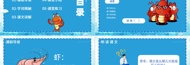 -課文講解有的……有的……句式有什么好處?“有的……有的……”的句式寫觸了小蝦的不同顏色,并以此來辨別老、小,突出了作者對小蝦的喜愛。