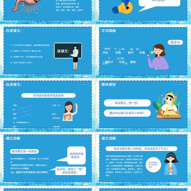 -課文主旨本文通過“我”捉小蝦、觀察小蝦打架、照顧小蝦的情景。交代了小蝦的一些生活習性,抒發了“我”對小蝦的喜愛之情。