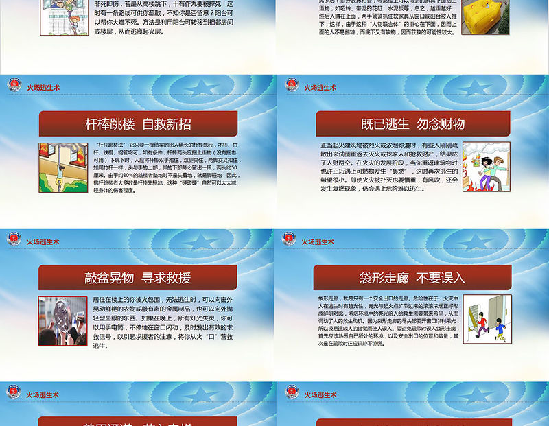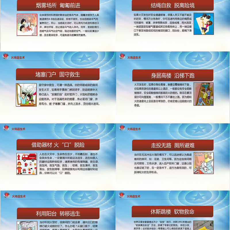 人處在火災中,生命危在旦夕,不到最后刻,誰也不會放棄生命,一定要竭盡所能設法逃生,逃生和救人的器材設施種類較多,通常使用的有緩降器、救生袋、救生網、救生氣墊、救生;;軟梯、救生滑桿、救生滑臺、救生舷梯等,如果能夠充分利用這些器材和設施,你就可以火“口”脫險。借助器材?火“口”脫險 火場逃生術