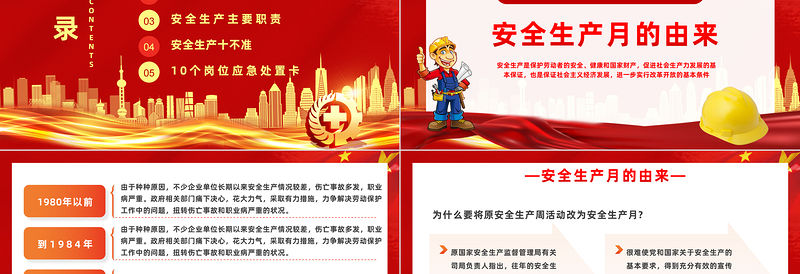 安全生產(chǎn)月的由來第01部分安全生產(chǎn)是保護勞動者的安全、健康和國家財產(chǎn),促進社會生產(chǎn)力發(fā)展的基本保證,也是保證社會主義經(jīng)濟發(fā)展,進一步實行改革開放的基本條件