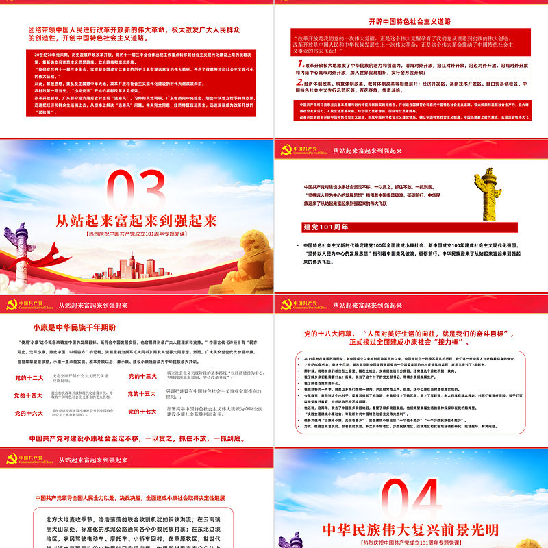 從站起來富起來到強起來中國共產黨對建設小康社會堅定不移,一以貫之,抓住不放,一抓到底。“堅持以人民為中心的發展思想”指引著中國乘風破浪,砥礪前行。中華民族迎來了從站起來富起來到強起來的偉大飛躍中國特色社會主義新時代確定建黨100年全面建成小康社會、新中國成立100年建成社會主義現代化強國。“堅持以人民為中心的發展思想”指引著中國乘風破浪,砥礪前行。中華民族迎來了從站起來富起來到強起來的偉大飛躍。建黨101周年