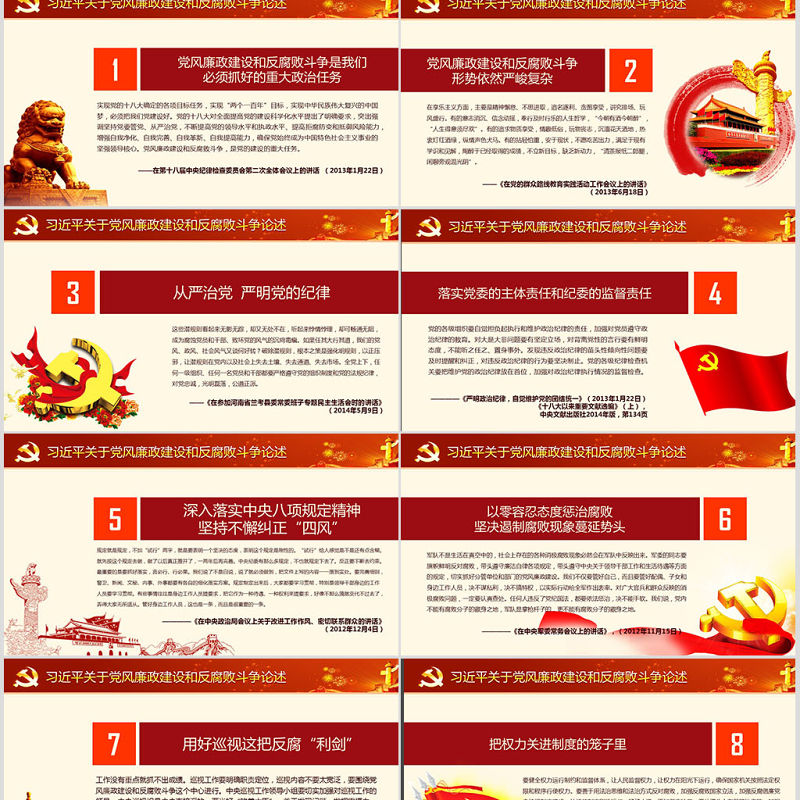 關于黨風廉政建設和反腐敗斗爭論述5深入落實中央八項規定精神堅持不懈糾正“四風”規定就是規定,不加“試行”兩字,就是要表明一個堅決的態度,表明這個規定是剛性的。“試行”給人感覺是不是還有點含糊。就先按這個規定去做,做了以后真正推開了,一兩年后再完善。中央紀委有那么多規定,不也就規定下去了。反正要不斷去約束。最重要的是要抓好落實,言必行、行必果。我們說了不是白說,說了就必須做到,把文件上寫的內容一一落到實處。要完善細則,警衛、新聞、文秘、內事、外事都要有各自的細化落實方案。規定制定出來后,大家都要學習貫徹,特別是領導干部身邊的工作人員要學習貫徹。有些事情往往是身邊工作人員提要求,把它作為一種待遇、一種權利來提要求,好像不那么搞就交代不過去了,弄得大家無所適從。管好身邊工作人員,這也是一條,而且是很重要的一條。————《在中央政治局會議上關于改進工作作風、密切聯系群眾的講話》(2012年12月4日)