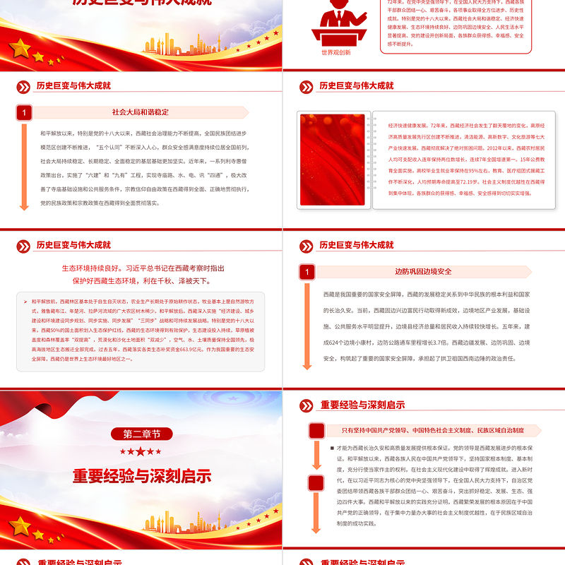 歷史巨變與偉大成就通過民主改革、成立自治區(qū)、社會主義改造,徹底廢除了政教合一的封建農(nóng)奴制,實現(xiàn)了社會制度歷史性跨越,開啟了現(xiàn)代化之路的探索。西藏和平解放有力維護了國家主權(quán)、祖國統(tǒng)一和領(lǐng)土完整世界觀創(chuàng)新