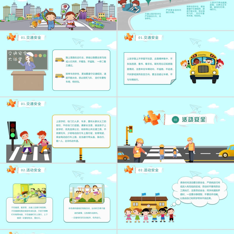 01.交通安全路上靠路右邊行走,穿越公路要走斑馬線或人行天橋,不著急、不猛跑, 一停二看三通過。騎單車的學生,更加要遵守交通規則,速度不能太快,禁止騎死飛車, 自行車要有車閘,有鈴鐺。