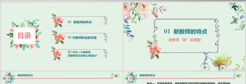 目錄01 新教師的特點02 對教師職業(yè)的態(tài)度03 作為一個新教師,需要哪些方面的心理成長?