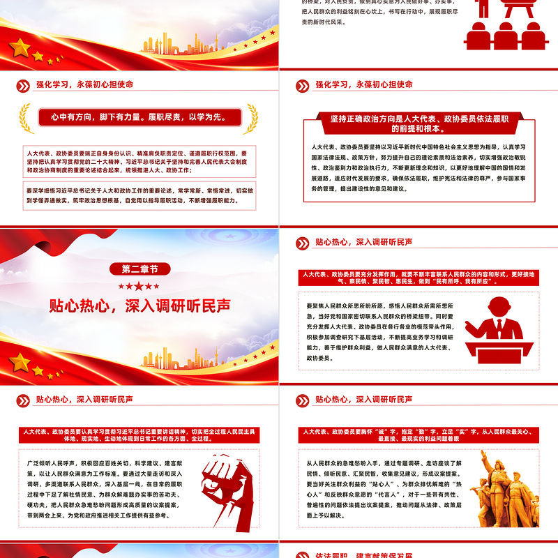 依法履職,建言獻策促發展人大代表、政協委員問需于民、問計于民,從群眾的急難愁盼問題中形成一條條意見建議,再將一條條意見建議推動轉化為看得見、摸得著的民生福祉,這是一個重大的課題,更是新時代賦予人大代表、政協委員的新要求。立足本職工作和當地實際,胸懷全國發展,提出真知灼見,為黨和政府科學決策提供有價值的參考,是人大代表、政協委員義不容辭的責任。帶著老百姓的呼聲和愿望,通過法定程序使黨的主張、人民意愿成為國家意志,為國家發展擘畫藍圖,凝聚廣大人民的智慧和力量共同奮斗,這是人大代表、政協委員依法履職的過程,也是人民當家作主的生動體現。