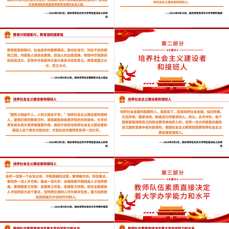 培養(yǎng)社會(huì)主義建設(shè)者和接班人——2018年5月2日,相關(guān)領(lǐng)導(dǎo)在北京大學(xué)師生座談會(huì)上的講話培養(yǎng)社會(huì)發(fā)展所需要的人,說具體了,就是培養(yǎng)社會(huì)發(fā)展、知識(shí)積累、文化傳承、國(guó)家存續(xù)、制度運(yùn)行所要求的人。所以,古今中外,每個(gè)國(guó)家都是按照自己的政治要求來培養(yǎng)人的,世界一流大學(xué)都是在服務(wù)自己國(guó)家發(fā)展中成長(zhǎng)起來的。我國(guó)社會(huì)主義教育就是要培養(yǎng)社會(huì)主義建設(shè)者和接班人。