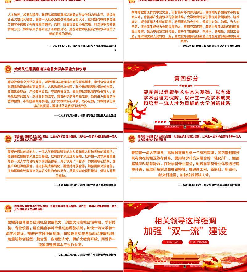 相關(guān)領(lǐng)導(dǎo)強(qiáng)調(diào)加強(qiáng)“雙一流”建設(shè)PPT紅色大氣風(fēng)黨員干部黨史學(xué)習(xí)專題教育黨課課件模板 Array