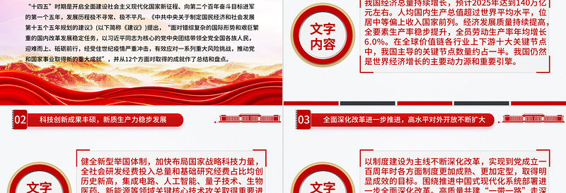 如何認識“十四五”時期 我國發展取得重大成就? ——黨的二十屆四中全會《建議》學習輔導百問(一)—— 匯報人:某某某 時間:2025.12.03 2025基層黨支部 “十四五”時期是開啟全面建設社會主義現代化國家新征程、向第二個百年奮斗目標進軍 的第一個五年,發展歷程極不尋常、極不平凡。《中共中央關于制定國民經濟和社會發展 第十五個五年規劃的建議》(以下簡稱《建議》)提出,“面對錯綜復雜的國際形勢和艱巨繁 重的國內改革發展穩定任務,以習近平同志為核心的黨中央團結帶領全黨全國各族人民, 迎難而上、砥礪前行,經受住世紀疫情嚴重沖擊,有效應對一系列重大風險挑戰,推動黨 和國家事業取得新的重大成就”,并從12個方面對取得的成就作了總結和盤點。 前 言 文字 內容 我國經濟總量持續增長,預計2025年達到140萬億 元左右。人均國內生產總值超過世界平均水平,位 居中等偏上收入國家前列。經濟發展質量持續提高, 全要素生產率穩步提升,全員勞動生產率年均增長 6.0%。在全球價值鏈各行業上下游十大關鍵節點 中,我國主導的關鍵節點數量約占一半。我國仍然 是世界經濟增長的主要動力源和重要引擎。 經濟運行穩中有進,高質量發展扎實推進 01 文字 內容 健全新型舉國體制,加快布局國家戰略科技力量, 全社會研發經費投入總量和基礎研究經費占比均創 歷史新高,集成電路、人工智能、量子技術、生物 醫藥、新能源等領域關鍵核心技術攻關取得重要進 展,科技創新和產業創新加快融合,高技術制造業 和戰略性新興產業成為引領帶動產業優化升級的重 要力量。 科技創新成果豐碩,新質生產力穩步發展 02 文字 內容 以制度建設為主線不斷深化改革,實現到黨成立一 百周年時各方面制度更加成熟、更加定型,取得明 顯成效的目標。圍繞推進中國式現代化系統部署進 一步全面深化改革。高質量共建“一帶一路”走深 走實,自由貿易試驗區和自由貿易港建設加快推進, 為經濟社會發展提供新機遇、拓展新空間。 全面深化改革進一步推進,高水平對外開放不斷擴大 03 文字 內容 社會主義民主政治制度化、規范化、程序化全面推 進,社會主義協商民主廣泛開展,愛國統一戰線鞏 固拓展,民族團結進步呈現新氣象,中國特色社會 主義法治體系不斷健全,司法體制改革取得新進展, 生動活潑、安定團結的政治局面得到鞏固和發展。 全過程人民民主深入發展,全面依法治國有效實施 04 文字 內容 堅持馬克思主義在意識形態領域指導地位的根本制 度,用黨的創新理論武裝全黨、教育人民、指導實 踐,以社會主義核心價值觀引領文化建設。優質公 共文化服務覆蓋城鄉基層,人民文明素養和社會文 明程度持續提升,文物保護利用和文化遺產保護傳 承全面加強,國際傳播效能持續提升,國家文化軟 實力和中華文化影響力不斷增強。 文化事業和文化產業蓬勃發展,精神文化產品豐富多彩 05 文字 內容 打贏脫貧攻堅戰,歷史性地解決了絕對貧困問題, 全面建成小康社會目標如期實現。在就業、收入分 配、教育、社會保障、衛生健康、住房保障、生育、 養老等領域推出一系列政策舉措,著力解決人民群 眾急難愁盼問題,公共服務供給力度不斷加大,鄉 村振興全面推進,全體人民共同富裕邁出堅實步伐。 民生保障扎實穩固,脫貧攻堅成果鞏固拓展 06 文字 內容 以碳達峰碳中和為牽引,綠色、循環、低碳發展加 快推進,建成全球規模最大的碳排放權交易市場和 清潔電力供應體系,非化石能源發電裝機容量超過 化石能源。污染防治攻堅戰向縱深推進,生態保護 紅線管理制度逐步完善,生態系統質量和穩定性持 續提升。 綠色低碳轉型步伐加快,生態環境質量持續改善 07 文字 內容 貫徹總體國家安全觀,國家安全領導體制和法治體 系、戰略體系、政策體系不斷完善,國家經濟安全 保障能力持續提升。加強黨對社會工作的領導,共 建共治共享的社會治理制度進一步健全。平安中國 建設成效明顯,我國成為世界上犯罪率最低、安全 感最高的國家之一。 08 國家安全能力有效提升,社會治理效能增強,社會大局保持穩定 文字 內容 堅持黨對人民軍隊的絕對領導,落實新時代強軍 目標,持續深化國防和軍隊改革,一體化國家戰 略體系和能力加快構建,現代化水平和實戰能力 顯著提升。人民軍隊堅決履行新時代使命任務, 以頑強斗爭精神和實際行動捍衛國家主權、安全、 發展利益。 國防和軍隊建設取得重大進展 09 文字 內容 堅持“一國兩制”“港人治港”“澳人治澳”、高 度自治的方針,健全港澳工作領導體制,推動香港 進入由亂到治走向由治及興的新階段,香港、澳門 保持長期穩定發展良好態勢。提出新時代黨解決臺 灣問題的總體方略,牢牢掌握兩岸關系主導權和主 動權。 “一國兩制”實踐深入推進 10 文字 內容 高舉構建人類命運共同體旗幟,堅定維護國際公平 正義,旗幟鮮明反對霸權主義和強權政治。積極建 設覆蓋全球的伙伴關系網絡,維護大國關系格局總 體穩定。參與引領全球治理體系改革和建設,全球 發展倡議、全球安全倡議、全球文明倡議、全球治 理倡議為攜手應對全球性挑戰貢獻了中國智慧和中 國方案,我國國際影響力、感召力、塑造力顯著提 升。 中國特色大國外交全面拓展 11 文字 內容 始終保持以黨的自我革命引領社會革命的高度自 覺,