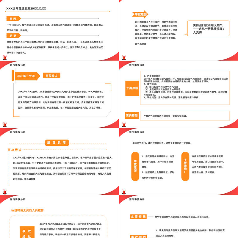 XXX燃氣管道泄漏20XX.X.XX下午1點05分,煤氣管道工程公司在檢修時,不慎將天然氣管道閥門損壞造成氣體泄漏,噴出的天然氣柱足有七層樓高。事故發生后附近三個居民區共420戶居民被緊急疏散,包括一所幼兒園、一所托兒所兩所學校近三百名小朋友在內的1000多人被緊急撤離,事故未造成人員傷亡。直到下午3點37分,發生泄漏的天然氣管才停止噴氣。