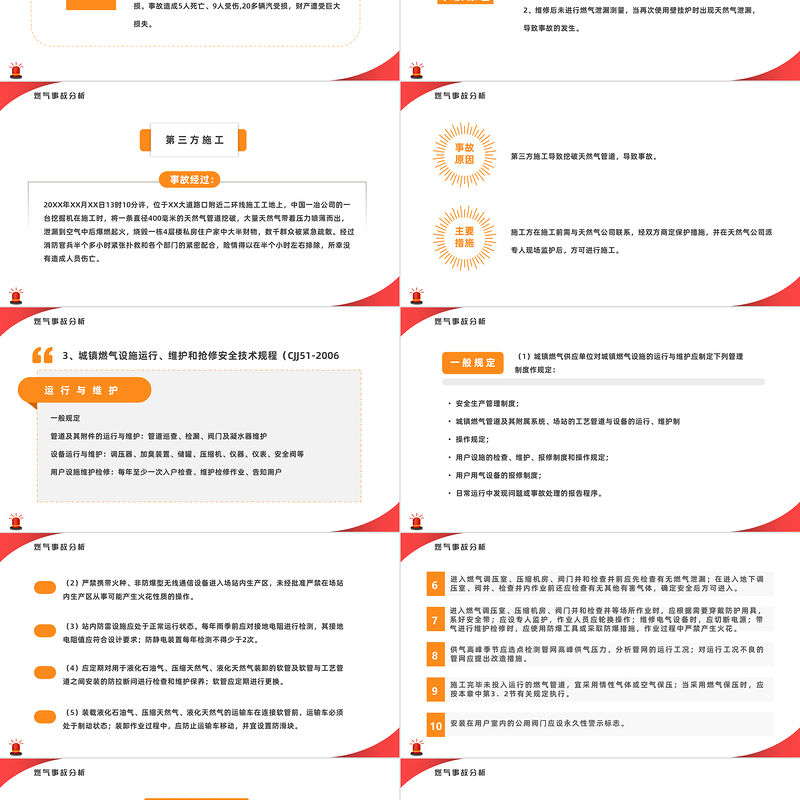 一般規定:事故搶修和上報制度、機構、裝備、預案、接警作業現場搶修作業:進入現場、地下泄漏點開挖、液化石油氣泄漏、壓縮機房、調壓站、用戶室內泄漏火災與爆炸:消防為主(協助及后續工作)搶修一般規定:方案報批(緊急事故除外)、負責、相應的設備停氣與降壓:管內壓力控制在300~500Pa范圍內動火:作業區、置換、燃氣濃度檢測、放散通氣:指維護、檢修或搶修之后的通氣停氣、降壓、動火及通氣