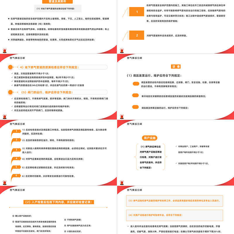 一般規定管道及其附件的運行與維護:管道巡查、檢漏、閥門及凝水器維護設備運行與維護:調壓器、加臭裝置、儲罐、壓縮機、儀器、儀表、安全閥等用戶設施維護檢修:每年至少一次入戶檢查、維護檢修作業、告知用戶