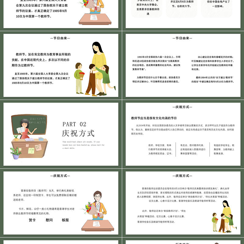 這是因為教師的工作在很大程度上決定著中國的未來。每年的教師節,中國各地的教師都以不同方式慶祝自己的節日。通過評選和獎勵,介紹經驗,幫助解決工資、住房、醫療等方面的實際困難,改善教學條件等,大大提高了廣大教師從事教育事業的積極性。 這是因為教師的工作在很大程度上決定著中國的未來。每年的教師節,中國各地的教師都以不同方式慶祝自己的節日。通過評選和獎勵,介紹經驗,幫助解決工資、住房、醫療等方面的實際困難,改善教學條件等,大大提高了廣大教師從事教育事業的積極性。—衍生文化—