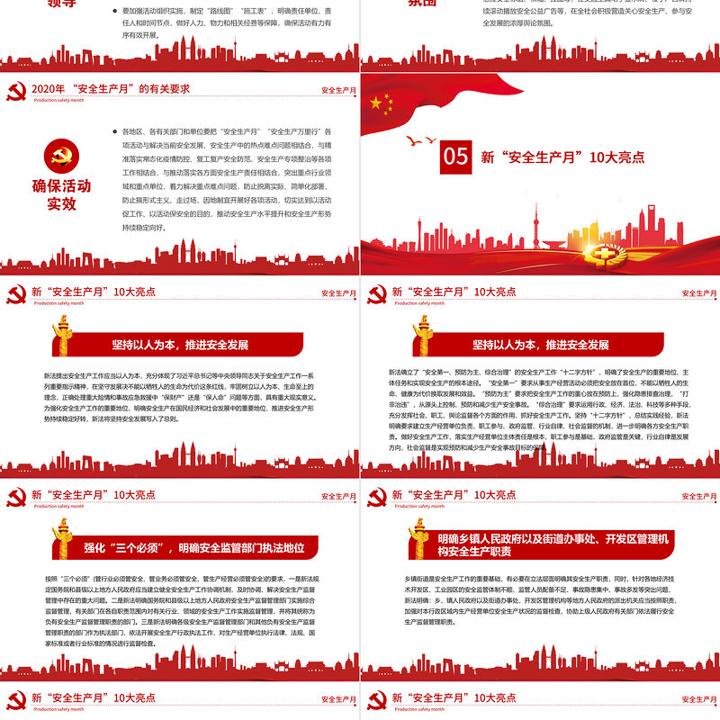 安全生產月新“安全生產月”10大亮點Production safety month新法提出安全生產工作應當以人為本,充分體現了等中央領導同志關于安全生產工作一系列重要指示精神,在堅守發展決不能以犧牲人的生命為代價這條紅線,牢固樹立以人為本、生命至上的理念,正確處理重大險情和事故應急救援中“保財產”還是“保人命”問題等方面,具有重大現實意義。為強化安全生產工作的重要地位,明確安全生產在國民經濟和社會發展中的重要地位,推進安全生產形勢持續穩定好轉,新法將堅持安全發展寫入了總則。