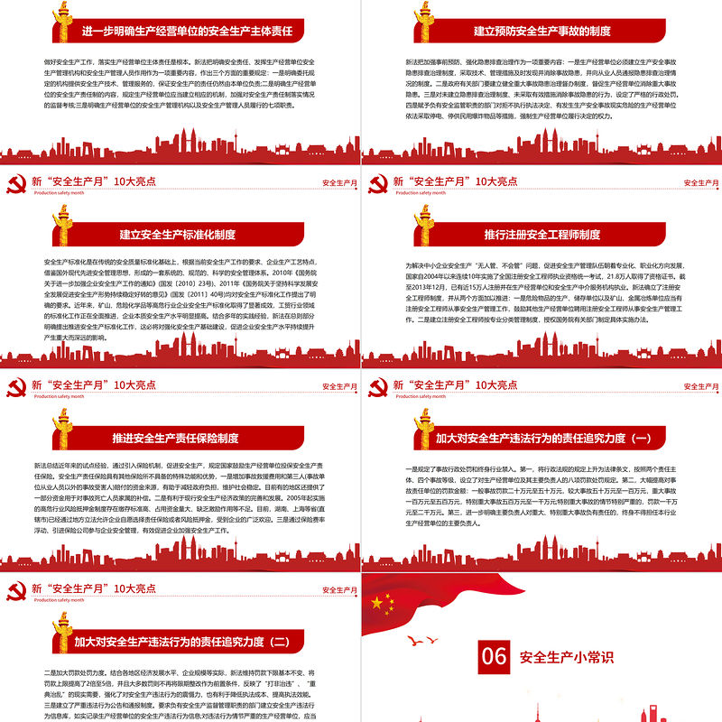 安全生產月新“安全生產月”10大亮點Production safety month二是加大罰款處罰力度。結合各地區經濟發展水平、企業規模等實際,新法維持罰款下限基本不變、將罰款上限提高了2倍至5倍,并且大多數罰則不再將限期整改作為前置條件,反映了“打非治違”、“重典治亂”的現實需要,強化了對安全生產違法行為的震懾力,也有利于降低執法成本、提高執法效能。三是建立了嚴重違法行為公告和通報制度。要求負有安全生產監督管理職責的部門建立安全生產違法行為信息庫,如實記錄生產經營單位的安全生產違法行為信息;對違法行為情節嚴重的生產經營單位,應當向社會公告,并通報行業主管部門、投資主管部門、國土資源主管部門、證券監督管理部門和有關金融機構。