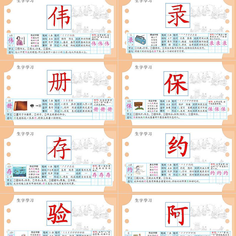 詞語理解創(chuàng)造:發(fā)明、制造了前所未有的事物。 造句:中華民族創(chuàng)造了輝煌的歷史。 鑄刻:在金屬上刻、鑄文字。 造句:鑄刻在青銅器上的文字被稱為金文。 攜帶:隨身帶著。 造句:圖書館禁止攜帶寵物進(jìn)入。