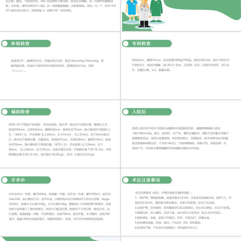 20XX-10-17我院產科彩超: 宮內見雙胎,胎兒甲:胎頭位于臍部左側,臀部右上方。雙頂徑92mm,頭圍329mm,腹圍320mm,股骨長徑73mm。胎心搏動位于臍部左上方,144次/分,羊水深度: 左上30mm,左下31mm ,右上27mm,右下24mm胎兒乙:胎頭位于臍部右側,右骶前位。雙頂徑91mm,頭圍328mm,腹圍319mm,股骨長徑70mm,胎心搏動位于臍部右側,147次/分,羊水深度: 左上29mm,左下26mm ,右上38mm,右下25mm。全血計數五分類:白細胞計數 7.50 10~9/L、中性粒細胞計數 5.30 10~9/L、血紅蛋白 93.00 g/L,肝功:白蛋白23.20 g/L 輔助檢查