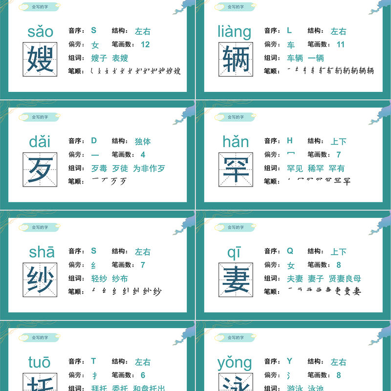 妻qī筆順:結構:上下偏旁:女筆畫數:8組詞:夫妻 妻子 賢妻良母 Q會寫的字