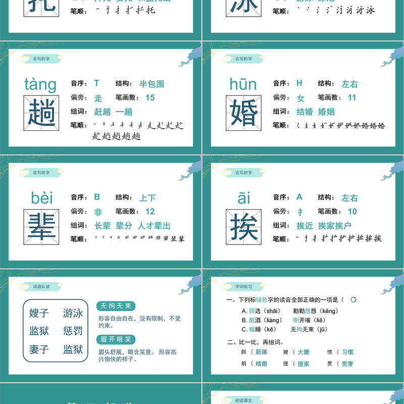 詞語認讀嫂子妻子懲罰監獄監獄游泳無拘無束形容自由自在,沒有限制,不受約束。眉開眼笑眉頭舒展,眼含笑意。 形容高興愉快的樣子。