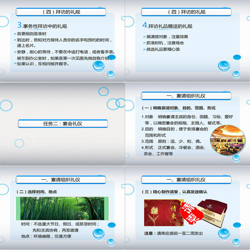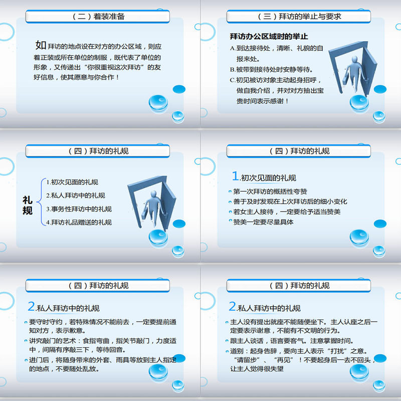 1.初次見面的禮規2.私人拜訪中的禮規3.事務性拜訪中的禮規4.拜訪禮品贈送的禮規
