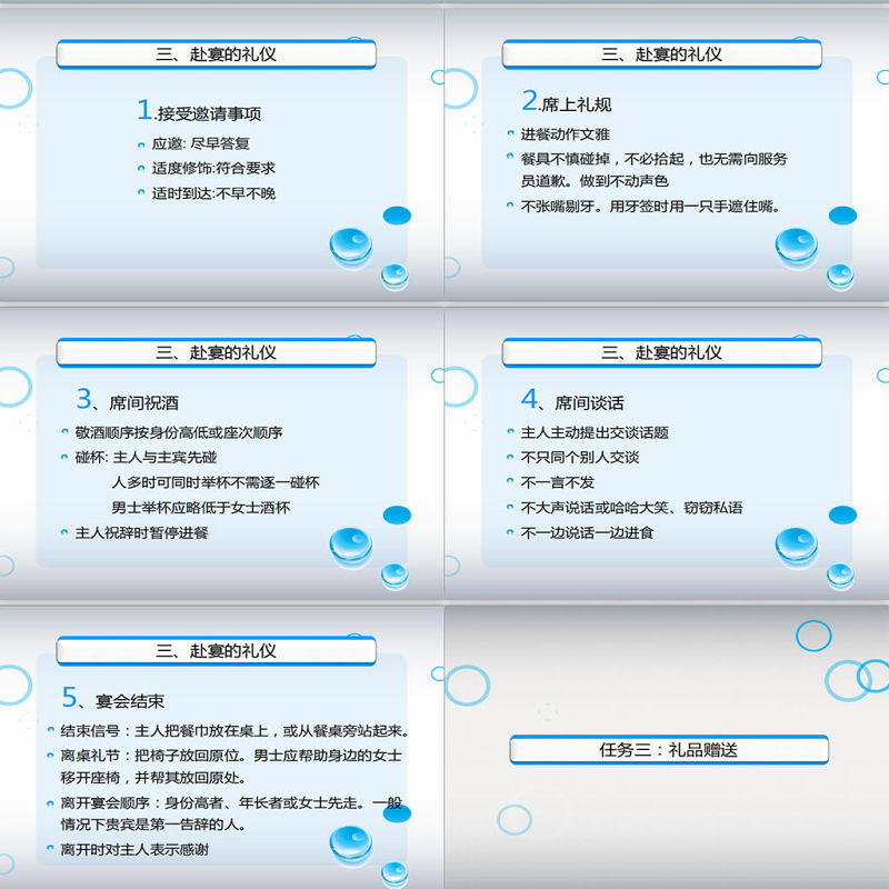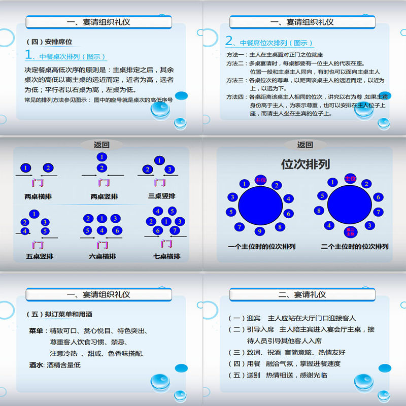 5、宴會結束結束信號:主人把餐巾放在桌上,或從餐桌旁站起來。離桌禮節:把椅子放回原位。男士應幫助身邊的女士移開座椅,并幫其放回原處。離開宴會順序:身份高者、年長者或女士先走。一般情況下貴賓是第一告辭的人。離開時對主人表示感謝