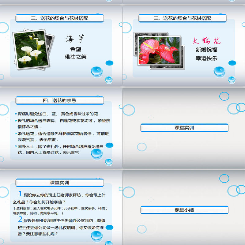 1.假設你去你的班主任老師家拜訪,你會帶上什么禮品?你會如何開始寒暄?(資料信息:愛人喜歡電子元件;兒子初中,喜歡軍事、科技;母親熱情、隨和,做菜水平高。) 2.假設是畢業后到班主任老師辦公室拜訪,邀請班主任去你公司做一場禮儀培訓,你又該如何準備?要注意哪些禮規?