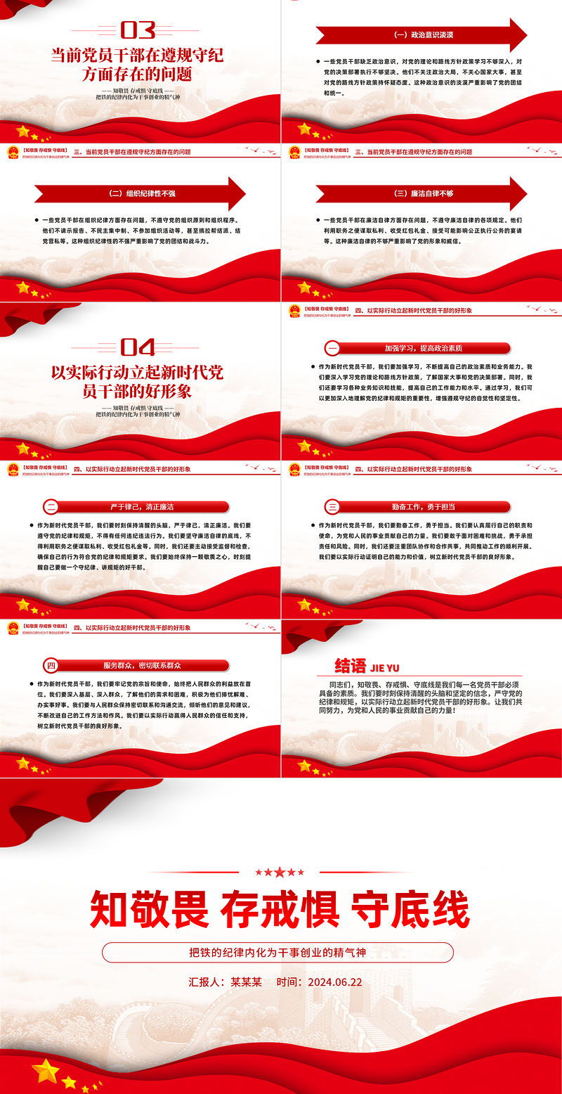 結語 JIE YU ?同志們,知敬畏、存戒懼、守底線是我們每一名黨員干部必須具備的素質。我們要時刻保持清醒的頭腦和堅定的信念,嚴守黨的紀律和規矩,以實際行動立起新時代黨員干部的好形象。讓我們共同努力,為黨和人民的事業貢獻自己的力量!