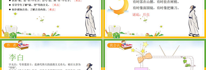 學習目標認識“夜、思”等9個生字,會寫“思、床”等7個生字。 (重點) 引導學生了解“疑、望”等的含義。 (重點) 初步感知古詩,了解古詩內容。(難點)