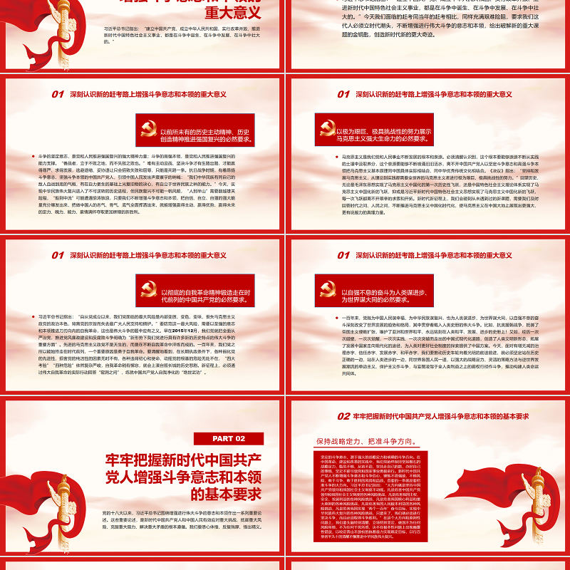 PART 01習(xí)近平總書記指出:“建立中國共產(chǎn)黨、成立中華人民共和國、實(shí)行改革開放、推進(jìn)新時(shí)代中國特色社會(huì)主義事業(yè),都是在斗爭中誕生、在斗爭中發(fā)展、在斗爭中壯大的。”深刻認(rèn)識(shí)新的趕考路上增強(qiáng)斗爭意志和本領(lǐng)的重大意義