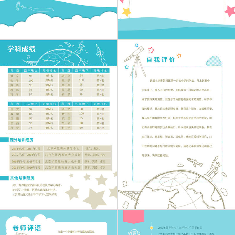 獲獎情況2012年獲得學校“三好學生”榮譽證書 2013年5月參加廣州“卓越杯”知識競賽獲一等獎 2013年9月通過廣州市通用外語等級考試(少兒英語口語) 2014年3月參加學校“我的家園”作文競賽獲二等獎2015年3月參加學校“我的家園”作文競賽獲二等獎2015年9月獲得學校“優秀學生”榮譽證書2015年9月獲得學校“優秀學生”榮譽證書