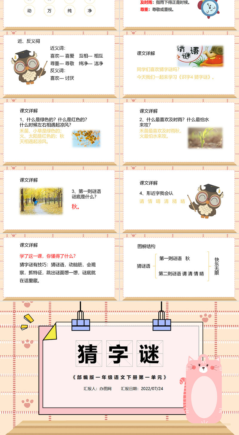 猜字謎《部編版一年級語文下冊第一單元》匯報人:辦圖網 匯報日期:2022/07/24
