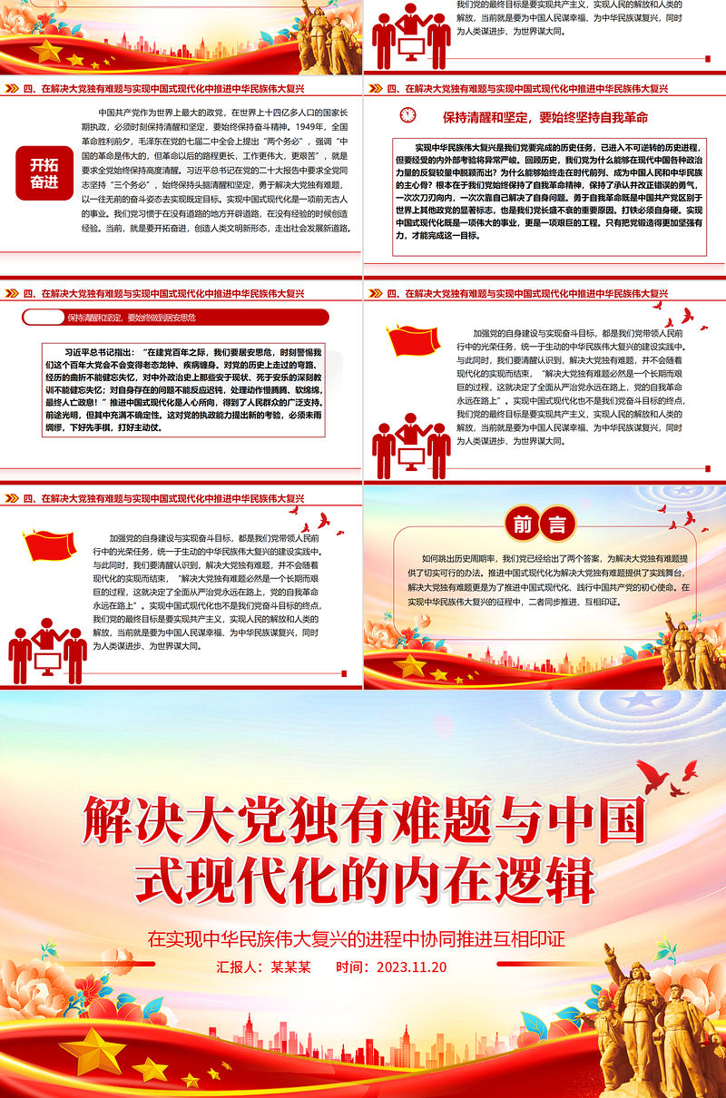 匯報人:某某某 時間:2023.11.20解決大黨獨有難題與中國式現(xiàn)代化的內(nèi)在邏輯在實現(xiàn)中華民族偉大復(fù)興的進程中協(xié)同推進互相印證