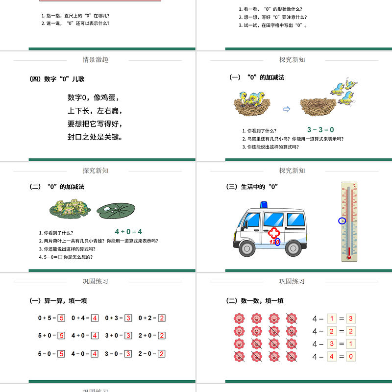 情景激趣(四)數(shù)字“0”兒歌數(shù)字0,像雞蛋,上下長,左右扁,要想把它寫得好,封口之處是關鍵。