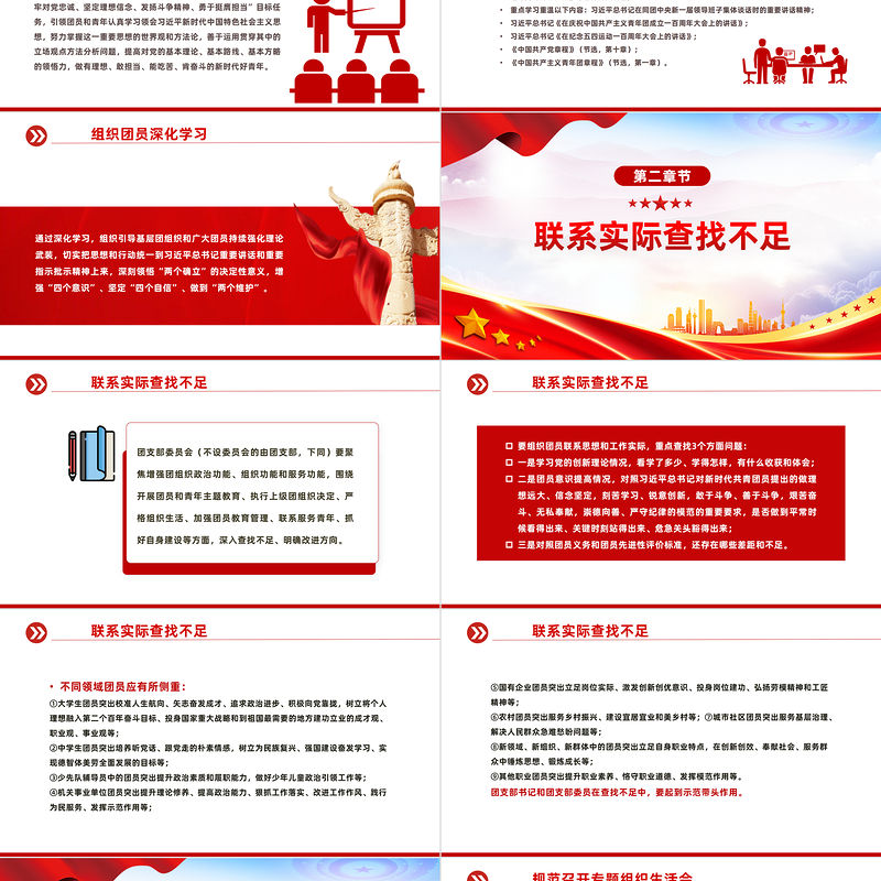 組織團(tuán)員深化學(xué)習(xí)要在扎實(shí)開展團(tuán)支部專題學(xué)習(xí)基礎(chǔ)上,采取集中學(xué)習(xí)和自學(xué)相結(jié)合的方式,組織團(tuán)員開展專題學(xué)習(xí)、深化認(rèn)識,為開好專題組織生活會、做好團(tuán)員教育評議工作打牢思想基礎(chǔ)。組織團(tuán)員認(rèn)真學(xué)習(xí)重溫《習(xí)近平著作選讀》、《習(xí)近平新時代中國特色社會主義思想專題摘編》、《論黨的青年工作》等著作相關(guān)篇目, 重點(diǎn)學(xué)習(xí)重溫以下內(nèi)容:習(xí)近平總書記在同團(tuán)中央新一屆領(lǐng)導(dǎo)班子集體談話時的重要講話精神; 習(xí)近平總書記《在慶祝中國共產(chǎn)主義青年團(tuán)成立一百周年大會上的講話》; 習(xí)近平總書記《在紀(jì)念五四運(yùn)動一百周年大會上的講話》; 《中國共產(chǎn)黨章程》(節(jié)選,第十章); 《中國共產(chǎn)主義青年團(tuán)章程》(節(jié)選,第一章)。