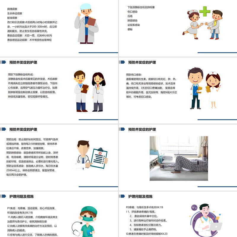 病情觀察生命體征觀察輸液觀察傷口和引流觀察:術后前兩小時每小時觀察并記錄,一小時內出血大于200-300ml時,應立即通知醫生,防止發生低血容量性休克。患肢血運觀察:術后一周,尤其48小時內患肢感覺運動觀察:術中常損傷坐骨神經術后護理