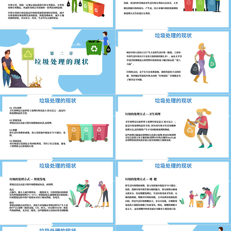 01 衛(wèi)生填埋衛(wèi)生填埋是目前世界上處理垃圾量最大 的方法之一,也是垃圾處理的最終手段. 02 焚燒發(fā)電焚燒法是在高溫下將垃圾燃燒成灰渣,再填埋.03 堆肥將生活垃圾堆積成堆,放入發(fā)酵池中保溫至70℃儲(chǔ)存、發(fā)酵,04 資源返還對(duì)垃圾進(jìn)行資源化分類(lèi)回收利用,節(jié)約了社會(huì)資源,避免了填埋和之后形成的污染。 垃圾處理的現(xiàn)狀