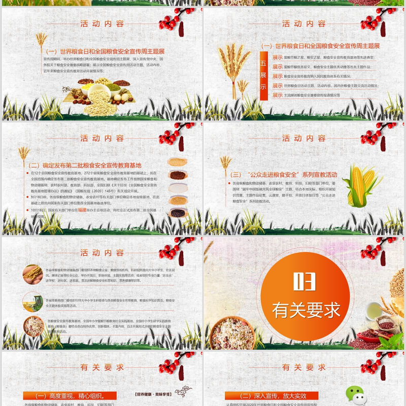 (一)世界糧食日和全國糧食安全宣傳周主題展宣傳周期間,舉辦世界糧食日和全國糧食安全宣傳周主題展,深入宣傳黨中央、國務院關于糧食安全重要戰(zhàn)略部署;展示全國糧食安全宣傳周活動主題、活動內容,近年來糧食安全宣傳教育活動開展情況等;