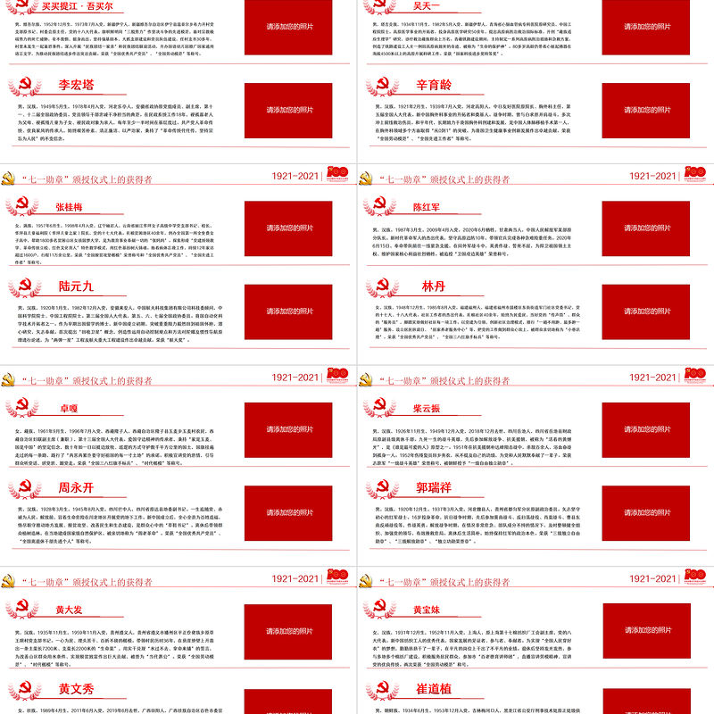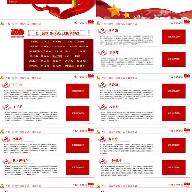 前 言新時代是需要英雄并一定能夠產生英雄的時代。中國共產黨要始終成為時代先鋒、民族脊梁,黨員隊伍必須過硬。希望受到表彰的同志珍惜榮譽、發揚成績,爭取更大光榮。各級黨組織要從工作和生活上關心愛護功勛黨員,大力宣傳“七一勛章”獲得者的感人事跡和崇高品德,在全黨全社會形成崇尚先進、見賢思齊的濃厚氛圍,激勵廣大黨員、干部牢記黨的性質宗旨,牢記黨的初心使命,不懈奮斗,永遠奮斗,在全面建設社會主義現代化國家新征程上,向著第二個百年奮斗目標、向著中華民族偉大復興的中國夢奮勇前進!