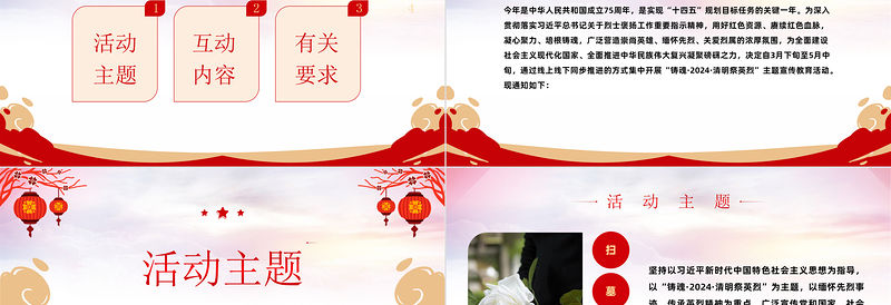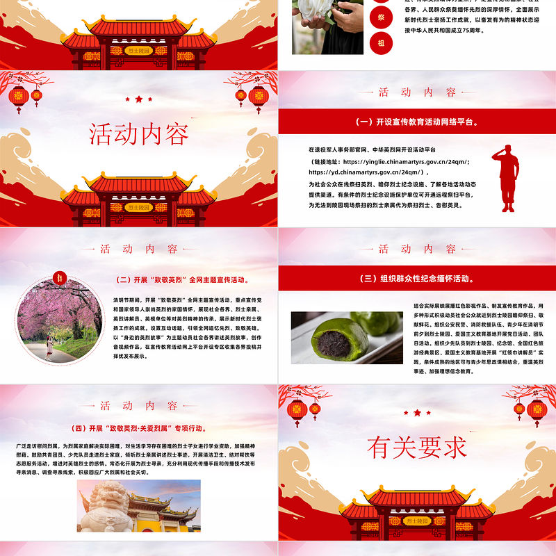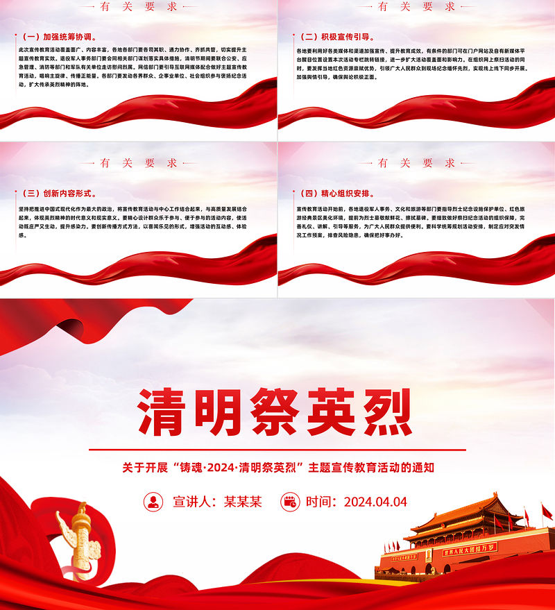 前言今年是中華人民共和國成立75周年,是實現“十四五”規劃目標任務的關鍵一年。為深入貫徹落實習近平總書記關于烈士褒揚工作重要指示精神,用好紅色資源、賡續紅色血脈,凝心聚力、培根鑄魂,廣泛營造崇尚英雄、緬懷先烈、關愛烈屬的濃厚氛圍,為全面建設社會主義現代化國家、全面推進中華民族偉大復興凝聚磅礴之力,決定自3月下旬至5月中旬,通過線上線下同步推進的方式集中開展“鑄魂·2024·清明祭英烈”主題宣傳教育活動。現通知如下: