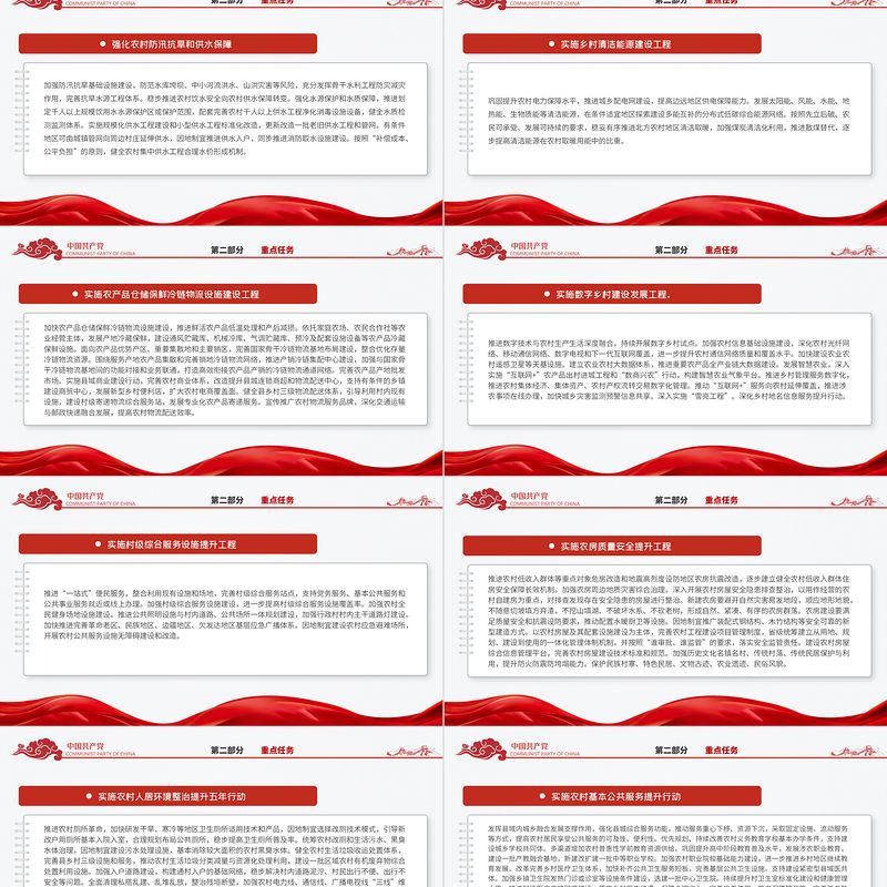 <p>《鄉村建設行動實施方案》</p><br><p>近日,中共中央辦公廳、國務院辦公廳印發了《鄉村建設行動實施方案》,并發出通知,要求各地區各部門結合實際認真貫徹落實。 《鄉村建設行動實施方案》主要內容如下?! ∴l村建設是實施鄉村振興戰略的重要任務,也是國家現代化建設的重要內容。黨的十八大以來,各地區各部門認真貫徹黨中央、國務院決策部署,把公共基礎設施建設重點放在農村,持續改善農村生產生活條件,鄉村面貌發生巨大變化。同時,我國農村基礎設施和公共服務體系還不健全,部分領域還存在一些突出短板和薄弱環節,與農民群眾日益增長的美好生活需要還有差距。為扎實推進鄉村建設行動,進一步提升鄉村宜居宜業水平,制定本方案。</p><br><p>目錄</p><br><p>【慶祝中國共產黨建黨100周年黨史黨課】第一部分總體要求</p><br><p>(一)指導思想以習近平新時代中國特色社會主義思想為指導,堅持農業農村優先發展,把鄉村建設擺在社會主義現代化建設的重要位置,順應農民群眾對美好生活的向往,以普惠性、基礎性、兜底性民生建設為重點,強化規劃引領,統籌資源要素,動員各方力量,加強農村基礎設施和公共服務體系建設,建立自下而上、村民自治、農民參與的實施機制,既盡力而為又量力而行,求好不求快,干一件成一件,努力讓農村具備更好生活條件,建設宜居宜業美麗鄉村。第一部分 總體要求</p><br><p>(二)工作原則 ——尊重規律、穩扎穩打。順應鄉村發展規律,合理安排村莊建設時序,保持足夠的歷史耐心,久久為功、從容建設。樹立正確政績觀,把保障和改善民生建立在財力可持續和農民可承受的基礎之上,防止刮風搞運動,防止超越發展階段搞大融資、大拆建、大開發,牢牢守住防范化解債務風險底線。 ——因地制宜、分類指導。鄉村建設要同地方經濟發展水平相適應、同當地文化和風土人情相協調,結合農民群眾實際需要,分區分類明確目標任務,合理確定公共基礎設施配置和基本公共服務標準,不搞齊步走、“一刀切”,避免在“空心村”無效投入、造成浪費?! ⒅乇Wo、體現特色。傳承保護傳統村落民居和優秀鄉土文化,突出地域特色和鄉村特點,保留具有本土特色和鄉土氣息的鄉村風貌,防止機械照搬城鎮建設模式,打造各具特色的現代版“富春山居圖”。第一部分 總體要求</p><br><p>(二)工作原則 ——政府引導、農民參與。發揮政府在規劃引導、政策支持、組織保障等方面作用,堅持為農民而建,尊重農民意愿,保障農民物質利益和民主權利,廣泛依靠農民、教育引導農民、組織帶動農民搞建設,不搞大包大攬、強迫命令,不代替農民選擇?! ü懿⒅?、長效運行。堅持先建機制、后建工程,統籌推進農村公共基礎設施建設與管護,健全建管用相結合的長效機制,確保鄉村建設項目長期穩定發揮效用,防止重建輕管、重建輕用?! 澕s資源、綠色建設。樹立綠色低碳理念,促進資源集約節約循環利用,推行綠色規劃、綠色設計、綠色建設,實現鄉村建設與自然生態環境有機融合。第一部分 總體要求</p><br><p>(三)行動目標到2025年,鄉村建設取得實質性進展,農村人居環境持續改善,農村公共基礎設施往村覆蓋、往戶延伸取得積極進展,農村基本公共服務水平穩步提升,農村精神文明建設顯著加強,農民獲得感、幸福感、安全感進一步增強。第一部分 總體要求</p><br><p>【慶祝中國共產黨建黨100周年黨史黨課】第二部分重點任務</p><br><p>第二部分 重點任務堅持縣域規劃建設一盤棋,明確村莊布局分類,細化分類標準。合理劃定各類空間管控邊界,優化布局鄉村生活空間,因地制宜界定鄉村建設規劃范圍,嚴格保護農業生產空間和鄉村生態空間,牢牢守住18億畝耕地紅線。嚴禁隨意撤并村莊搞大社區、違背農民意愿大拆大建。積極有序推進村莊規劃編制。發揮村莊規劃指導約束作用,確保各項建設依規有序開展。建立政府組織領導、村民發揮主體作用、專業人員開展技術指導的村莊規劃編制機制,共建共治共享美好家園。</p><br><p>第二部分 重點任務繼續開展“四好農村路”示范創建,推動農村公路建設項目更多向進村入戶傾斜。以縣域為單元,加快構建便捷高效的農村公路骨干網絡,推進鄉鎮對外快速骨干公路建設,加強鄉村產業路、旅游路、資源路建設,促進農村公路與鄉村產業深度融合發展。推進較大人口規模自然村(組)通硬化路建設,有序推進建制村通雙車道公路改造、窄路基路面拓寬改造或錯車道建設。加強通村公路和村內道路連接,統籌規劃和實施農村公路的穿村路段建設,兼顧村內主干道功能。積極推進具備條件的地區城市公交線路向周邊重點村鎮延伸,有序實施班線客運公交化改造。開展城鄉交通運輸一體化示范創建。加強農村道路橋梁、臨水臨崖和切坡填方路段安全隱患排查治理。深入推進農村公路“安全生命防護工程”。加強農村客運安全監管。強化消防車道建設管理,推進林區牧區防火隔離帶、應急道路建設。</p><br><p>第二部分 重點任務加強防汛抗旱基礎設施建設,防范水庫垮壩、中小河流洪水、山洪災害等風險,充分發揮骨干水利工程防災減災作用,完善抗旱水源工程體系。穩步推進農村飲水安全向農村供水保障轉變。強化水源保護和水質保障,推進劃定千人以上規模飲用水水源保護區或保護范圍,配套完善農村千人以上供水工程凈化
