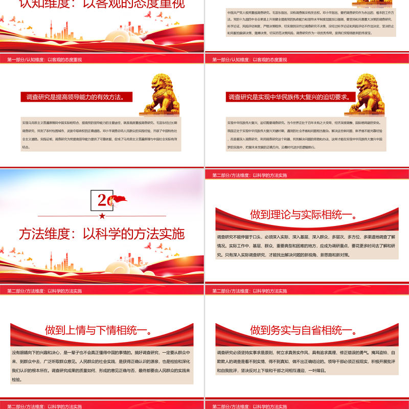 第二部分/方法維度:以科學的方法實施調查研究不能停留于口頭,必須深入實際、深入基層、深入群眾,多層次、多方位、多渠道地調查了解情況。實際工作中,基層、群眾、重要典型和困難的地方,應成為調研重點,要花更多時間去了解和研究。只有深入實際調查研究,才能找出解決問題的新視角、新思路和新對策。做到理論與實際相統一。