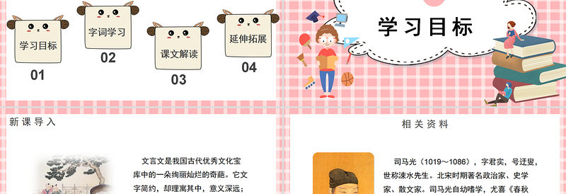 新課導入 文言文是我國古代優秀文化寶庫中的一朵絢麗燦爛的奇葩。它文字簡約,卻理寓其中,意義深遠;語言凝練,卻不失形象生動。《司馬光》就是這樣一篇文言文。我們一起來領略一下文言文的魅力吧!