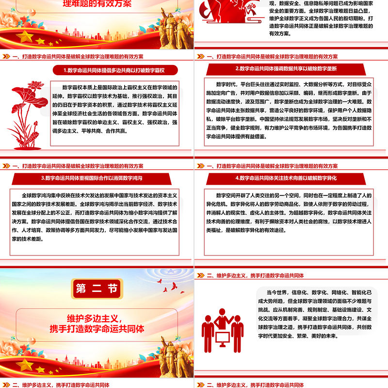 當(dāng)今世界,信息化、數(shù)字化、網(wǎng)絡(luò)化、智能化已成大勢(shì)所趨,但全球數(shù)字治理領(lǐng)域仍面臨不少難題與挑戰(zhàn)。應(yīng)從機(jī)制完善、規(guī)則制定、基礎(chǔ)設(shè)施建設(shè)、文化交流等方面著手,凝聚全球數(shù)字治理合力,共謀全球數(shù)字治理之道,攜手打造數(shù)字命運(yùn)共同體,共創(chuàng)數(shù)字時(shí)代更加安全、繁榮、美好的未來(lái)。二、維護(hù)多邊主義,攜手打造數(shù)字命運(yùn)共同體