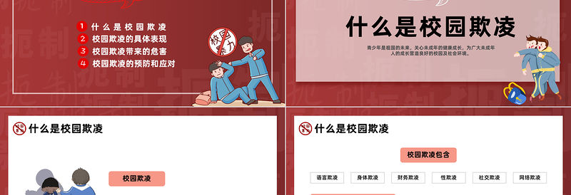 什么是校園欺凌校園欺凌包含校園欺凌易發生的時課間時間,上學、放學途中;校內隱蔽場所、學校附近。語言欺凌身體欺凌財務欺凌性欺凌社交欺凌網絡欺凌校園欺凌發生時間和地點